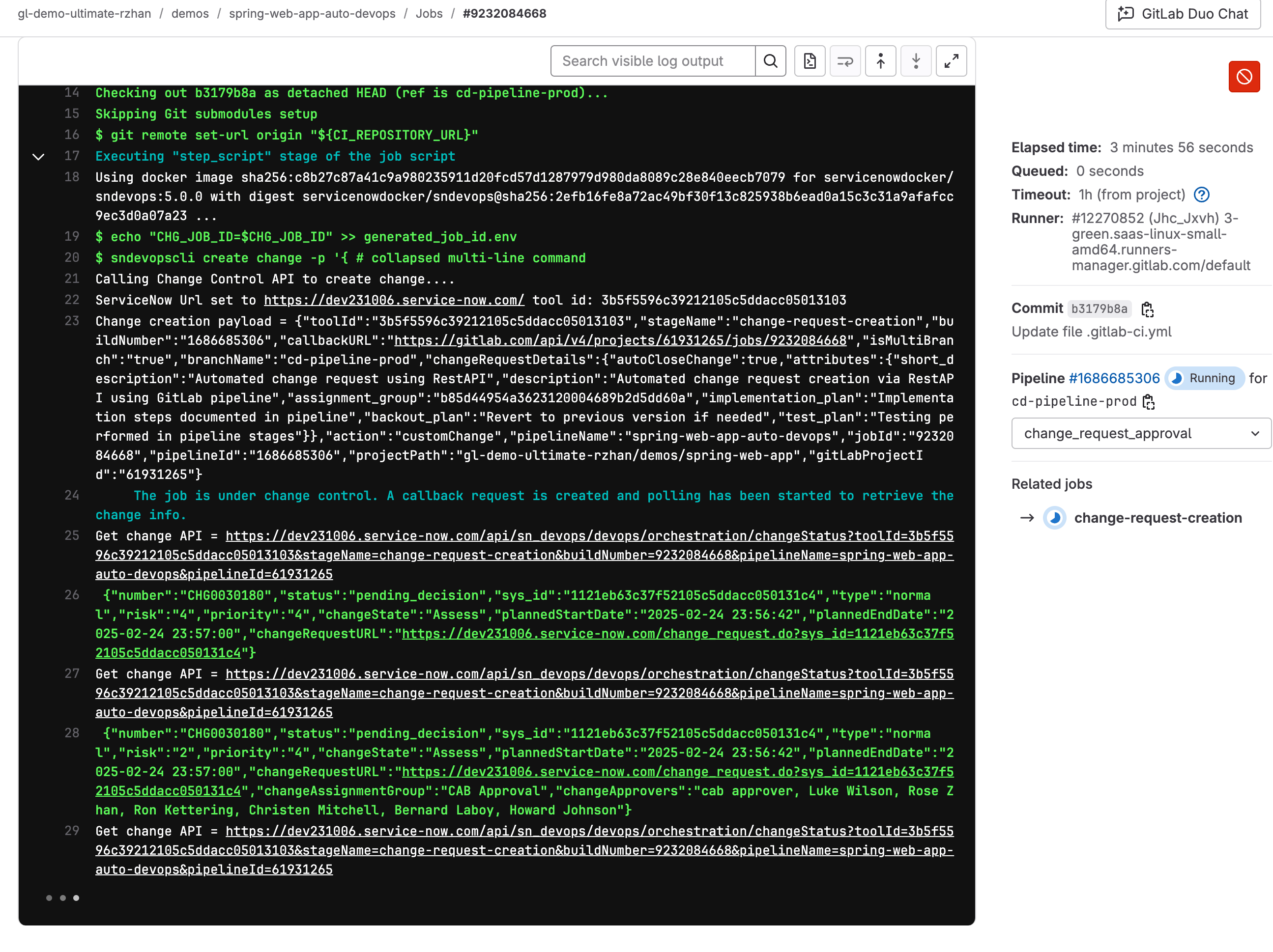 In GitLab, change request number and other information can be found in the pipeline details. The pipeline job will remain running until the change request is approved, then it will proceed to the next job.
