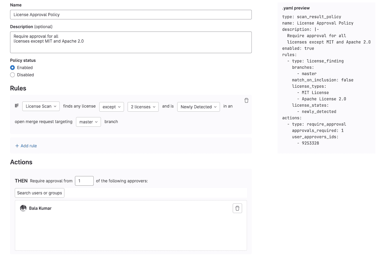 - Create a new merge request approval policy.
