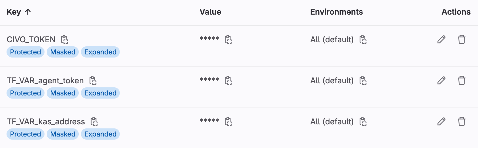 TF_VAR_civo_region: Set your cluster’s region.TF_VAR_cluster_name: Set your cluster’s name.TF_VAR_cluster_description: Set a description for the cluster. To create a reference to your GitLab project on your Civo cluster detail page, set this value to$CI_PROJECT_URL. This value helps you determine which project was responsible for provisioning the cluster you see on the Civo dashboard.TF_VAR_target_nodes_size: Set the size of the nodes to use for the clusterTF_VAR_num_target_nodes: Set the number of Kubernetes nodes.TF_VAR_agent_version: Set the version of the GitLab agent for Kubernetes.TF_VAR_agent_namespace: Set the Kubernetes namespace for the GitLab agent for Kubernetes.